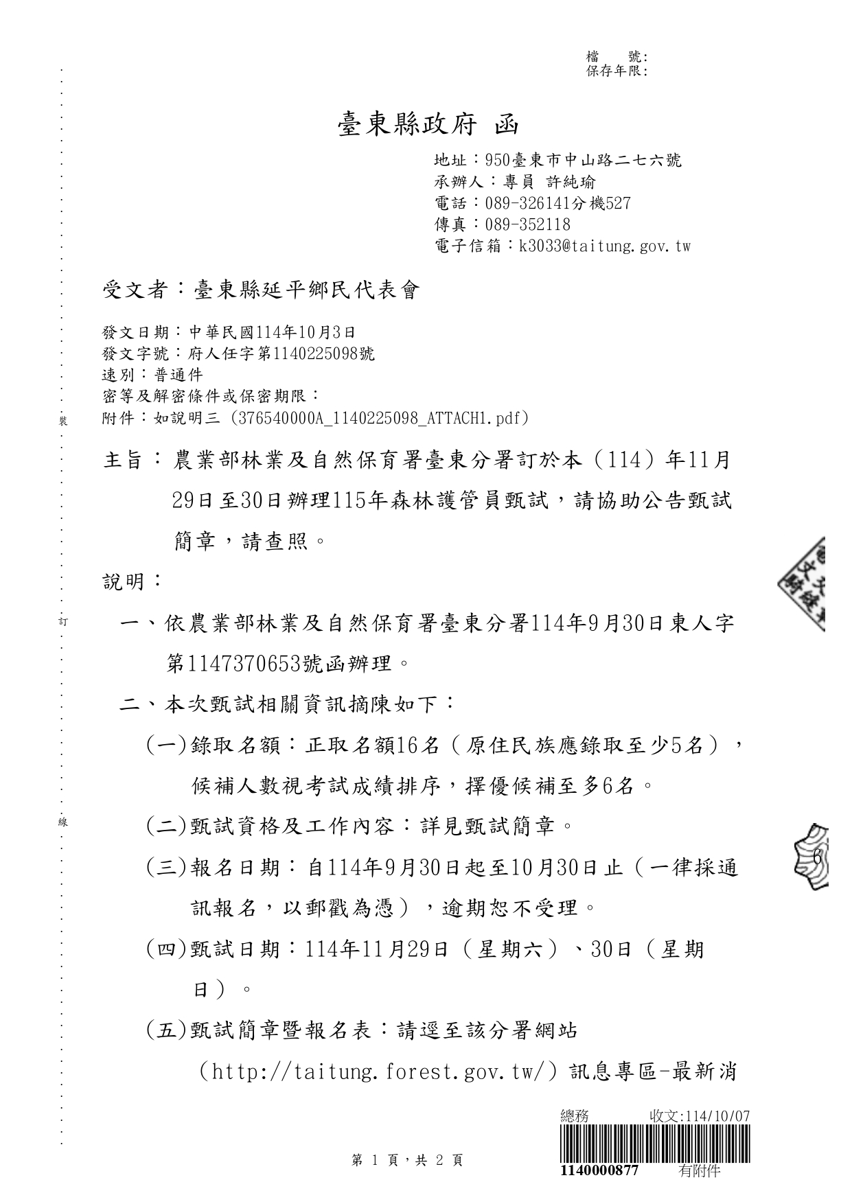 轉貼訊息:農業部林業及自然保育署臺東分署訂於本114年11月29日至30日辦理115年森林護管員甄試公文.